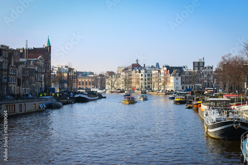 Obraz premium Boats are cruising through the water canal in Amsterdam city during the day