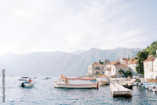 Fototapeta premium Boats are moored at the pier of the ancient town of Perast. Montenegro