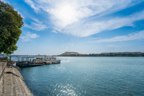 © twabian, Obraz premium Boats are moored on the Nile River near Aswan Egypt The view shows the river banks and distant landforms under a blue sky while heading towards Philae Nubian site.