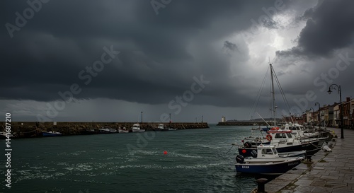 © Zainul, Fototapeta premium Boats Docked in Harbor Under Dramatic Cloudy Sky Landscape