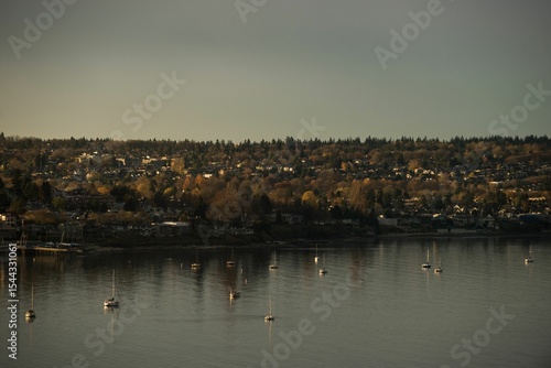 © vectorfusionart, Fototapeta premium Boats in lake against sky