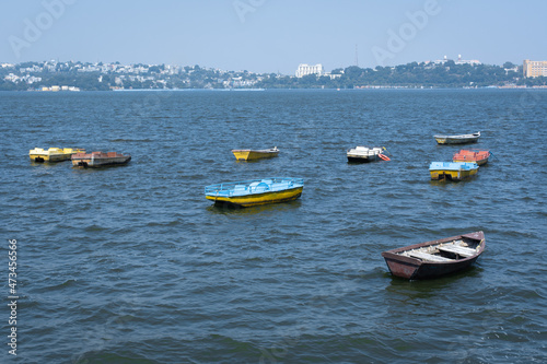 Naklejka premium Boats in the upper lake at Bhopal which is also known as 'city of lakes'.