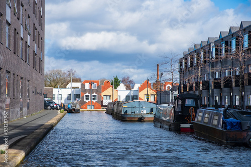 Fototapeta premium Boats moored in a canal in New Islington newly developed area in Manchester