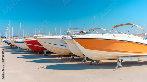 Obraz premium Boats on a Trailer in the Parking Lot of a Marina | Ready for Transport and Outdoor Adventure