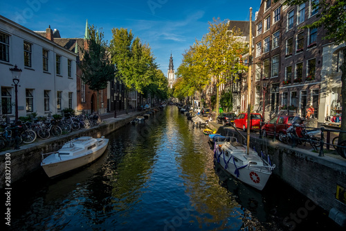 Obraz premium Boats on canal in Amsterdam, Netherlands