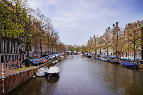 © Roman Babakin, Obraz premium Boats on canal of Amstel River and buildings Amsterdam