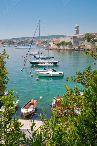 © Pablo Debat, Fototapeta premium Boats on little port beside Krk old town view with vegetation -