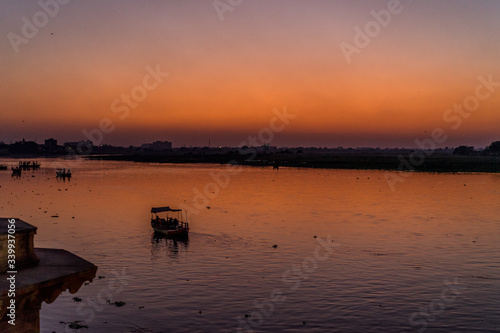 Naklejka premium Boats on river in India during sunset