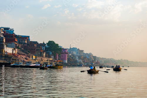 © Hans, Obraz premium Boats on the Ganges - sunrise
