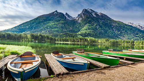 Fototapeta premium Boats on the lake Hintersee in the Alps, Germany