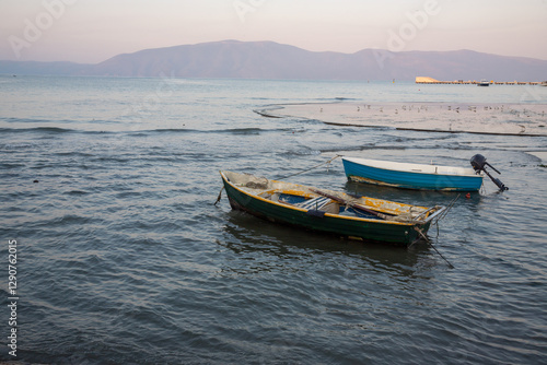 Naklejka premium Boats quietly bobbing on calm waters at sunset near a mountainous landscape