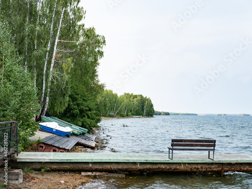 Fototapeta premium boats stand on the sandy shore. around trees, water, a pier. the beginning of...