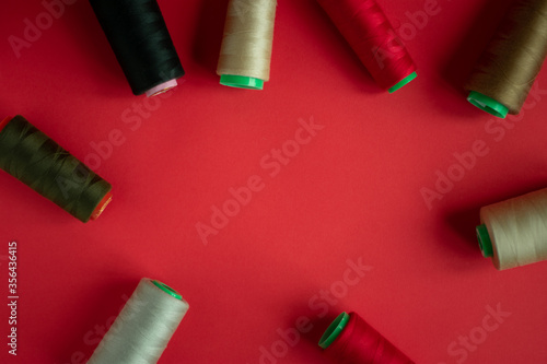 Fototapeta premium Bobbins on red background. Sew and tailoring concept, sewing tools, needlework.