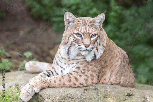 © Yuval Helfman, Naklejka premium Bobcat (Lynx rufus californicus) resting on a rock and posing. Santa Clara County, California, USA.