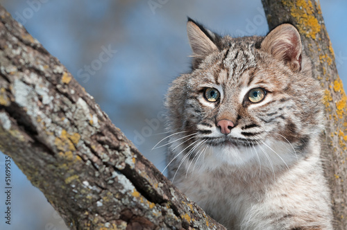 © hkuchera, Obraz premium Bobcat (Lynx rufus) in Tree with Copy Space Left