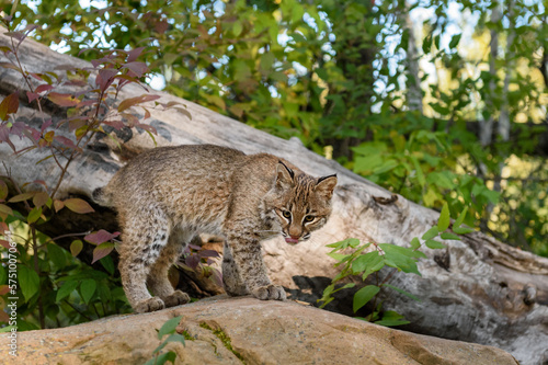 Obraz premium Bobcat (Lynx rufus) Licks Nose While Standing on Rock Autumn