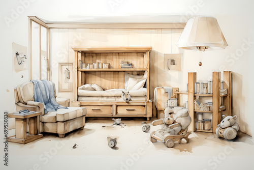 Obraz premium Boceto minimalista a lapiz y acuarela de interior de viviendas con mobiliario...