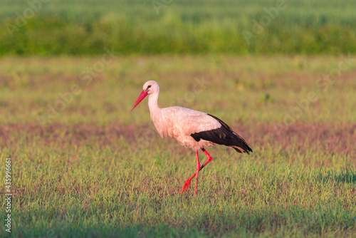 © boguslavus, Fototapeta premium Bocian poszukujący na skoszonej łące żeru.