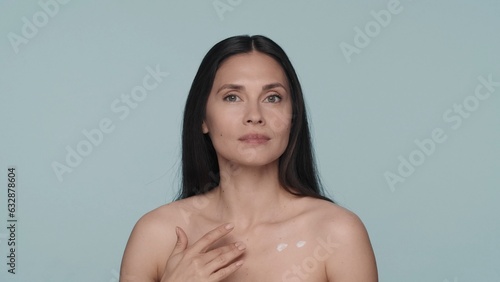 Obraz premium Body cream. The woman applies the cream to the chest area. Portrait of a seminude woman with clean, smooth skin on a blue background close up. The concept of beauty, cosmetology, skin and body care.