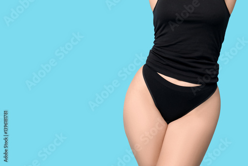 Fototapeta premium Body positive young woman in underwear on blue background, closeup