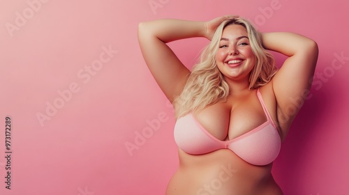 © Johannes, Obraz premium Body positivity, happy cute smiling plus size model blonde in flesh color underwear on pink background, copy space for text