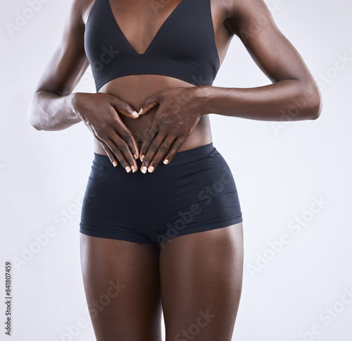Fototapeta premium Body, stomach and heart hands by woman in studio for wellness, diet and...