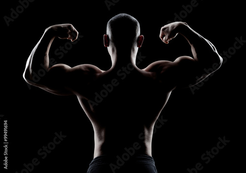 © Restyler, Fototapeta premium bodybuilder demonstrates biceps back view on a dark background