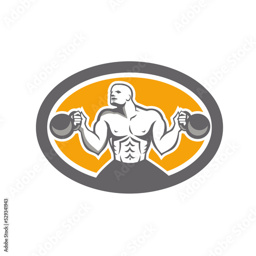 Naklejka premium Bodybuilder Lifting Kettlebell Front Oval Retro