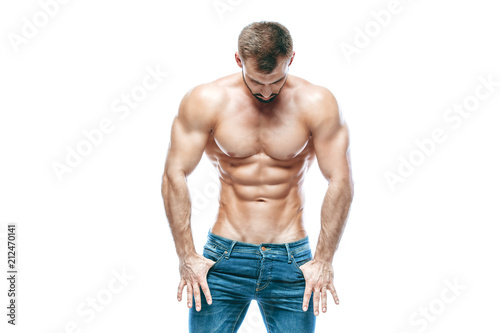 © satyrenko, Fototapeta premium bodybuilder posing. Beautiful sporty guy male power. Fitness muscled in blue jeans. on isolated white background.