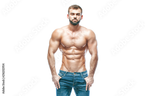 Fototapeta premium bodybuilder posing. Beautiful sporty guy male power. Fitness muscled in blue jeans. on isolated white background.