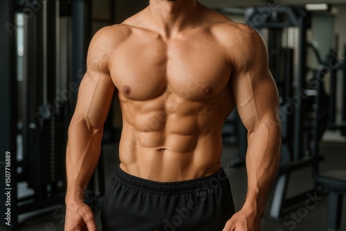 © Boke, Fototapeta premium Bodybuilder showing his defined abs and muscles in the gym