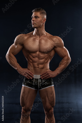 Fototapeta premium Bodybuilder showing off his perfect low fat body without clothes in studio