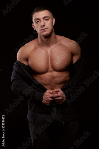 Fototapeta premium Bodybuilder standing in black hoodie. Studio shot. Isolated