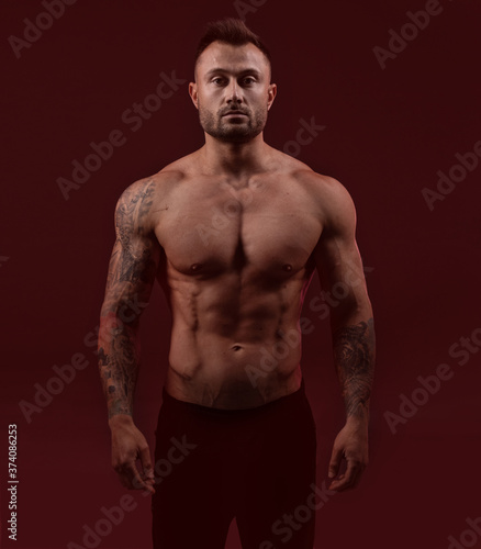 Fototapeta premium Bodybuilder strong man with an ideal body on red dark background.