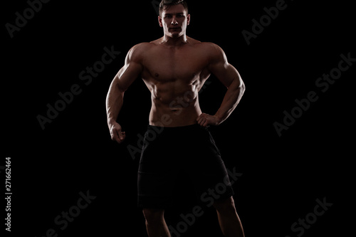 © Mike Orlov, Obraz premium Bodybuilding competitions on the scene. Man sportsmen physique and athlete. Black background with lights.