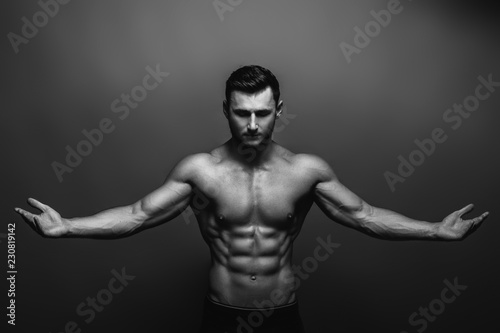 Fototapeta premium Bodybuilding. Strong man posing on background. Athletic young boy showing...