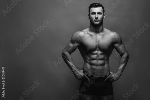 © VAKSMANV, Naklejka premium Bodybuilding. Strong man posing on background. Athletic young boy showing muscles.