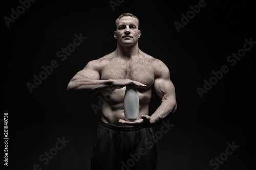 Fototapeta premium Bodycare and hygiene for sportsman. Bodybuilder hold shampoo or gel bottle....