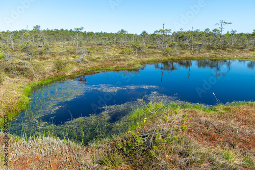 Obraz premium bog landscape, spring-colored bog vegetation, small bog lakes, islands covered with small bog pines, grass, moss