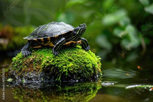 Fototapeta premium Bog Turtle Resting on Mossy Stone in Pond | Water Reptile Wildlife in Natural Habitat