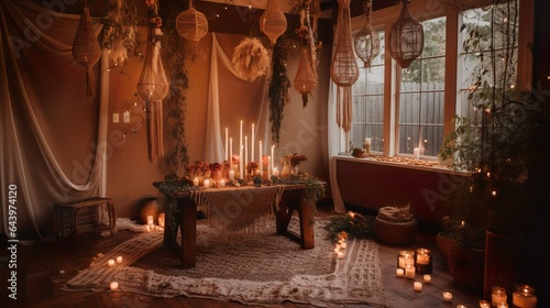 Naklejka premium Bohemian cozy wedding ceremony decor in autumn season