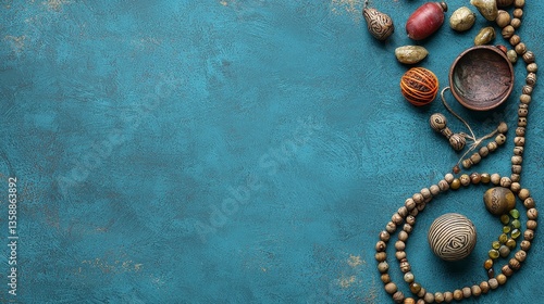 © Bounpaseuth, Naklejka premium Bohemian Decor Teal Textured Background with Wooden Beads and Stones