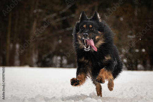 Naklejka premium Bohemian Shepherd Dog is running in snow. he is so happy outside. Dogs in...