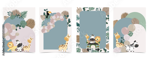© piixypeach, Naklejka premium Boho arch template background with paper palm leaves and balloons
