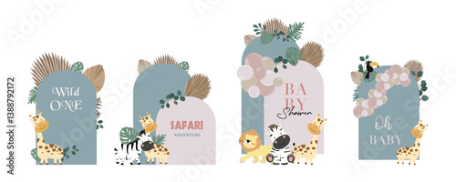 © piixypeach, Naklejka premium Boho backdrop element object with balloons and paper palm leaves