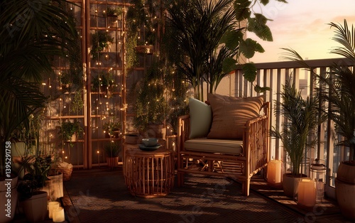 Fototapeta premium Boho balcony with bamboo furniture, fairy lights, soft cushions, lots of greenery, sunset lighting, peaceful corner