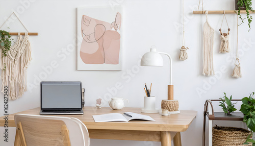 Obraz premium Boho Chic Home Office Workspace with Wooden Desk and Macrame Decor