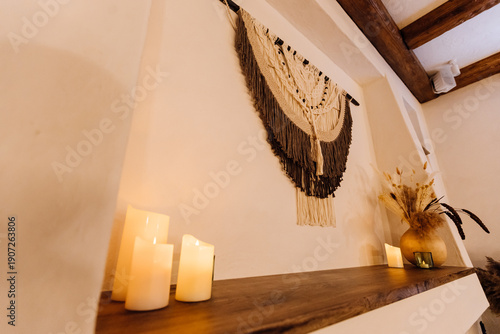 Obraz premium Boho macrame wall hanging with candles and dried flowers on rustic shelf