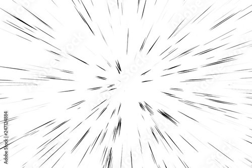 Fototapeta premium Bokeh black lines on white background, abstraction, abstract speed light motion blur texture, star particle or space traveling, black and white extrusion effect