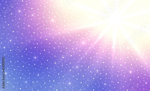 © avextra, Obraz premium Bokeh fly in sunshine on blue lilac background. Magical sky abstract illustration.